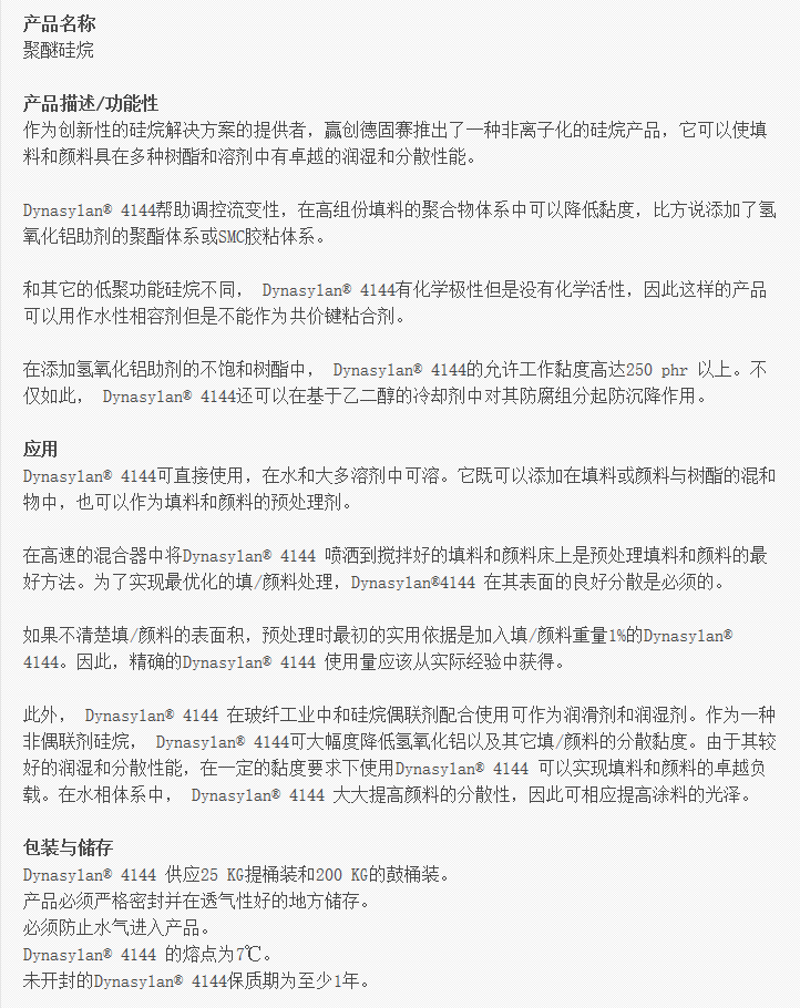 赢创硅烷偶联剂Dynasylan® 4144德固赛4144聚醚硅烷 产品资料下载列表: