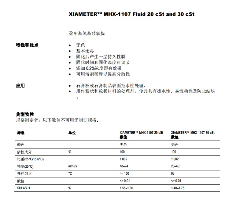 道康宁(DOW) 含氢硅油 MHX-1107 FLUID 30CS 硅油乳液 产品资料下载列表: