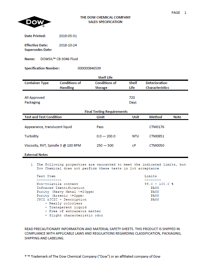 道康宁(DOW)CB-3046 Fluid 特种硅油化妆品硅油 产品资料下载列表: