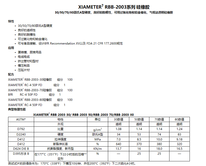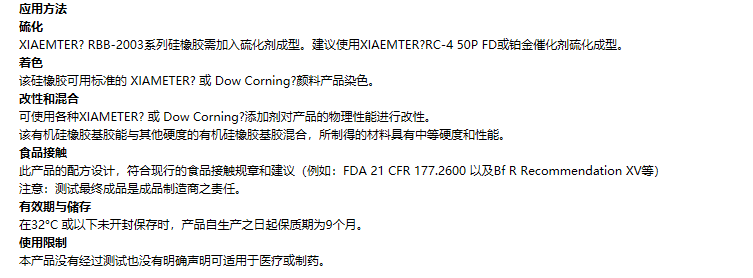 XIAEMTER?RBB-2003系列硅像胶需加入硫化剂成型.建议使用XIAEMTER?RC-450PFD或金催化剂疏化成型。