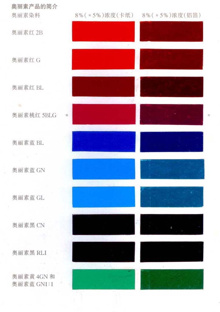 奥丽素染料主要用在铝箔和镀金塑料薄膜印刷,木器漆和自行车漆,色泽鲜艳明亮。在醇类、酮类和醚类溶剂中有很好的溶解性,但通常不溶或微溶于烃类,具有极高的鲜艳度和很好的稳定性。