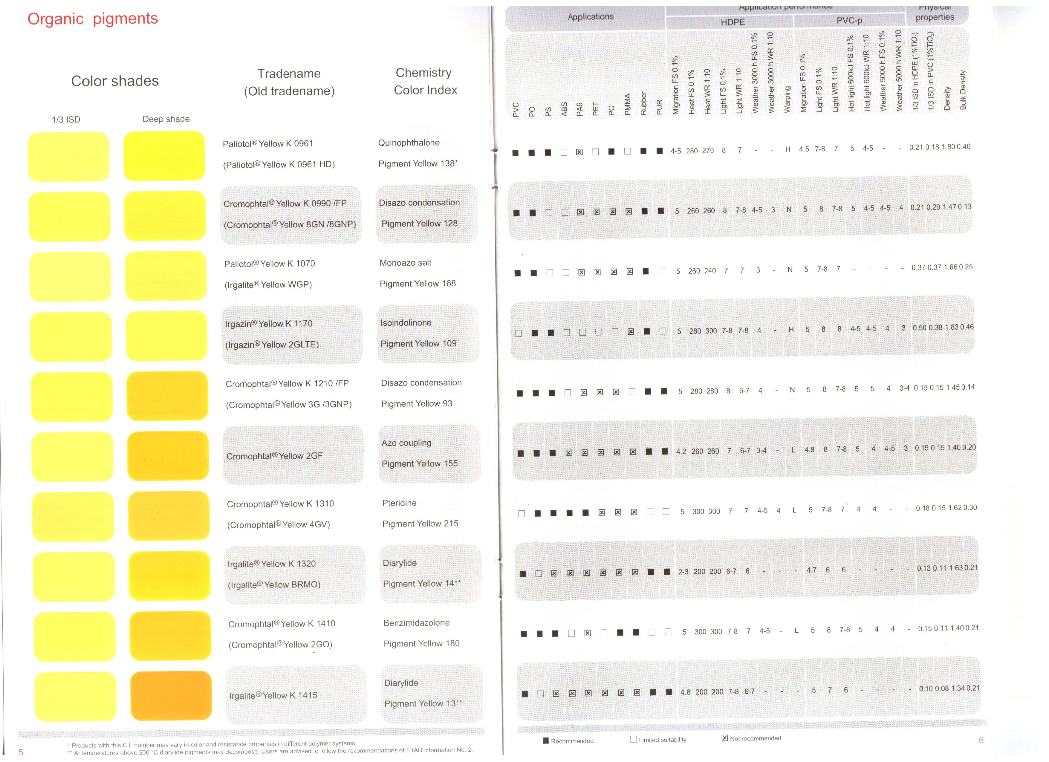 产品特性:艳佳丽系列产品是一类非常实用的传统型有机颜料,着色强度很高,色光鲜艳,色谱齐全,适合一般聚氯乙烯 、聚苯乙烯等塑料着色。