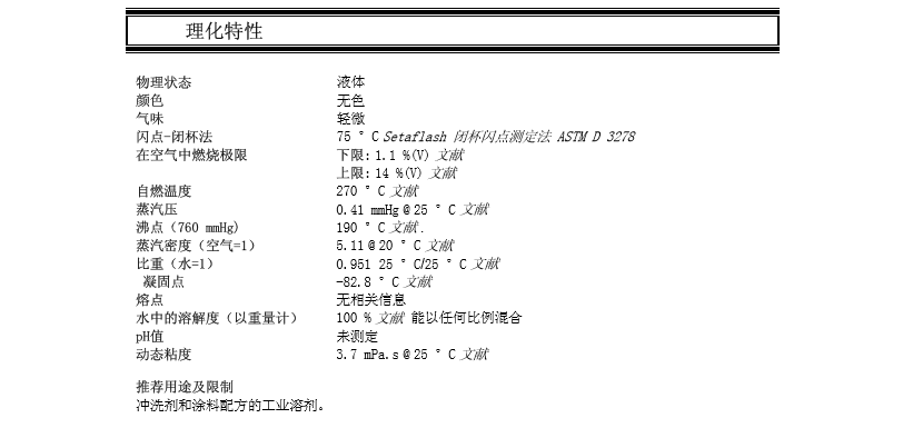 应用:用作水基稀释涂料的偶联剂(常混合使用);水基涂料的活性溶剂;家用和工业清洁剂、除脂剂和脱漆剂、金属清洁剂;溶剂型丝网印刷油墨的基本溶剂、偶联剂;还原染料织物的偶联剂、溶剂;化妆品配方的偶联剂和护肤剂;农业杀虫剂的稳定剂;香精的定香剂;地面光亮剂的凝结剂。