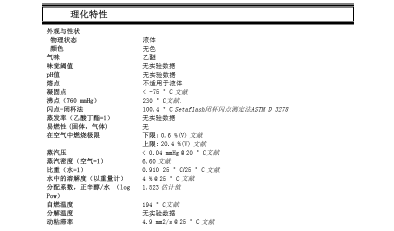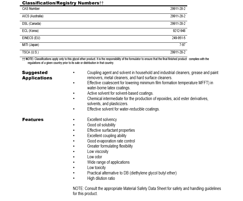 清 洗 剂:适合用于清洗剂特别是要求极低挥发速度的体系中,譬如除蜡剂和地板清洁剂。是润滑脂和油脂很好的偶合剂,可用作除漆剂和动物油脂除去剂。