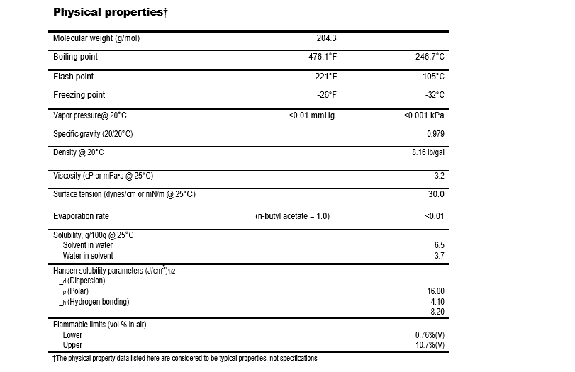 产品特性:无色带有愉快香气的液体,微溶于水,能和大多数有机溶剂混溶。沸点246.4℃。