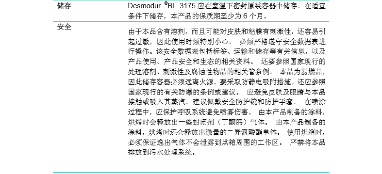 应用:与Desmophen®类产品配用制备耐光单组分聚氨酯烘烤涂料;在 传统烘烤型体系中作助剂以改进漆膜的柔韧性和附着力。