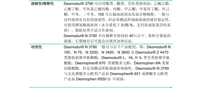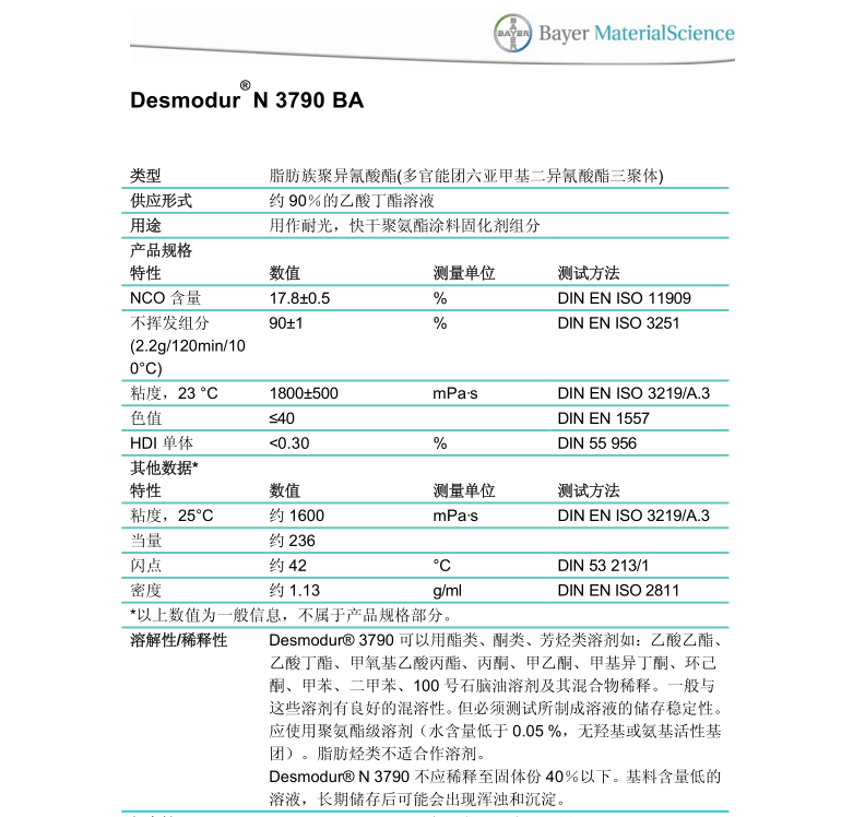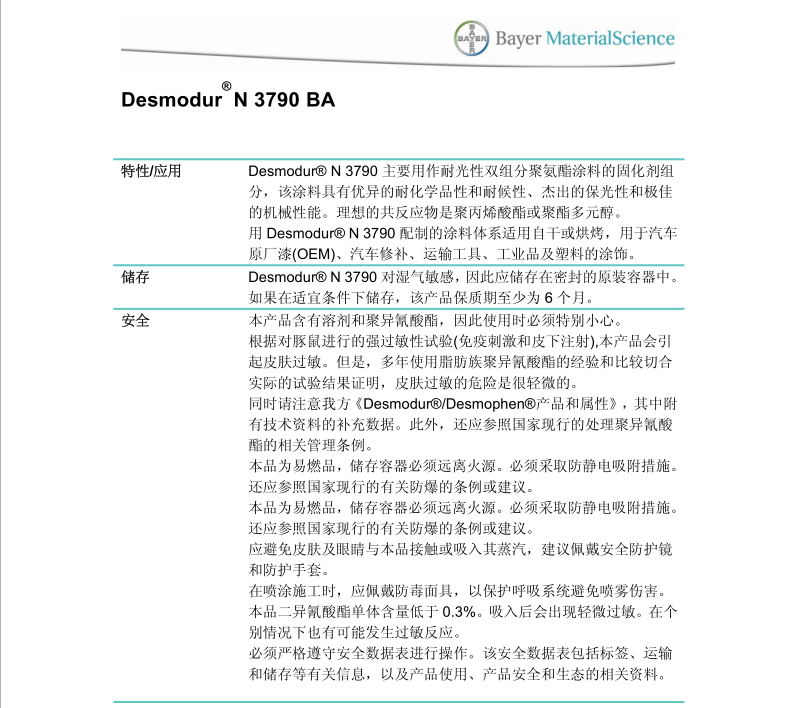产品特性:脂肪族聚异氰酸酯(多官能团六亚甲基二异氰酸酯三聚体)