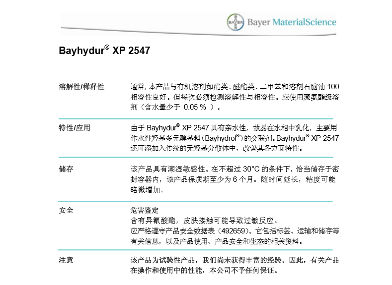 应用:Bayhydur® XP 2655 是 一 种 适 用 于 水 性 体 系 的 交 联 剂 ; 此 类 水 性 体 系 需 具 有 混 溶 稳 定 性 和 耐 化 学 品 性 好 的 特 点 。