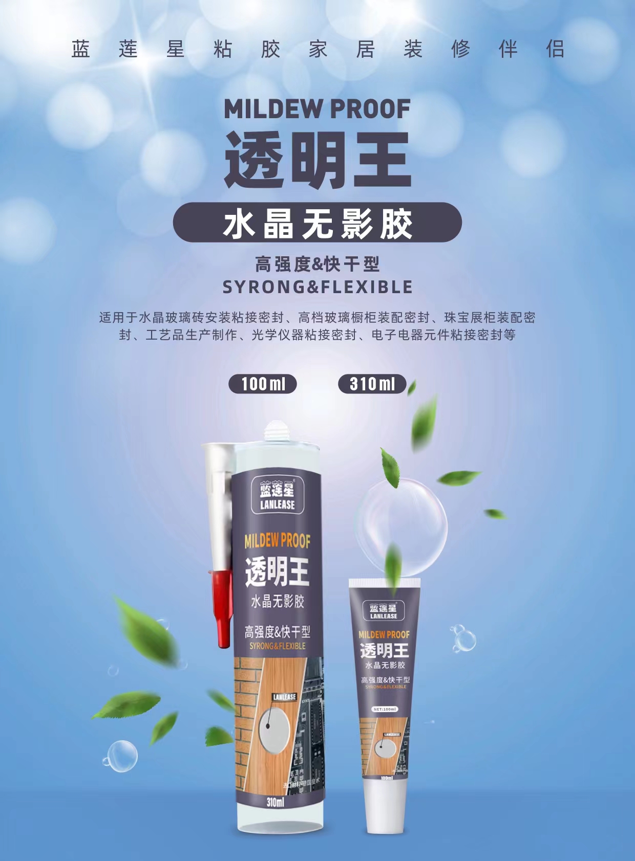 蓝莲星水晶无影胶,适用于水晶玻璃砖安装粘接密封、高档玻璃橱柜装配密封、珠宝展柜装配密封、工艺品生产制作、光学仪器粘接密封、电子电器元件粘接密封等