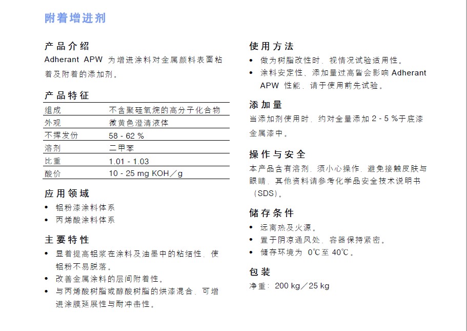 德谦APW 为增进涂料对金属颜料表面粘着及附着的添加剂。