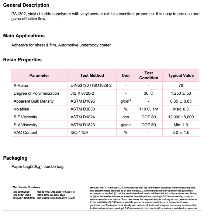 产品型号韩国LG化学PVC糊树脂PA1302