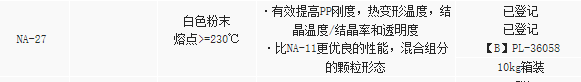 日本艾迪科成核剂NA-27有效提高PP刚度,热变形温度,结晶温度/结晶率和透明度,比NA-11更优良的性能,混合组分的颗粒形态;